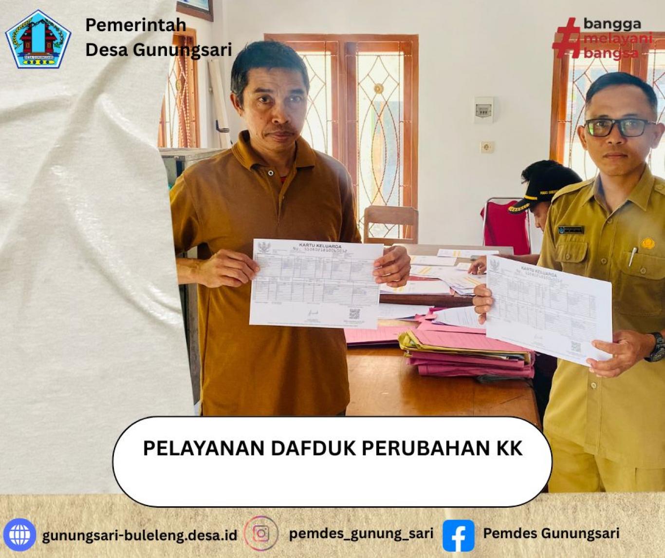 Pemerintah Desa Gunungsari melakukan Inovasi Aku Online-NG Pelayanan Dafduk Perubahan Elemen Kartu Keluarga dengan menyerahkan dokumen berupa Kartu Keluarga kepada Warga Banjar Dinas Sekar, Desa Gunungsari pada Senin, 30 Maret 2026.