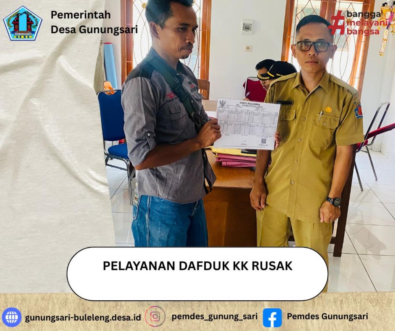 Pemerintah Desa Gunungsari melakukan Inovasi Aku Online-NG Pelayanan Dafduk Pembetulan Kartu Keluarga Rusak dengan menyerahkan dokumen berupa Kartu Keluarga kepada Warga Banjar Dinas Sekar, Desa Gunungsari pada Senin, 30 Maret 2026.