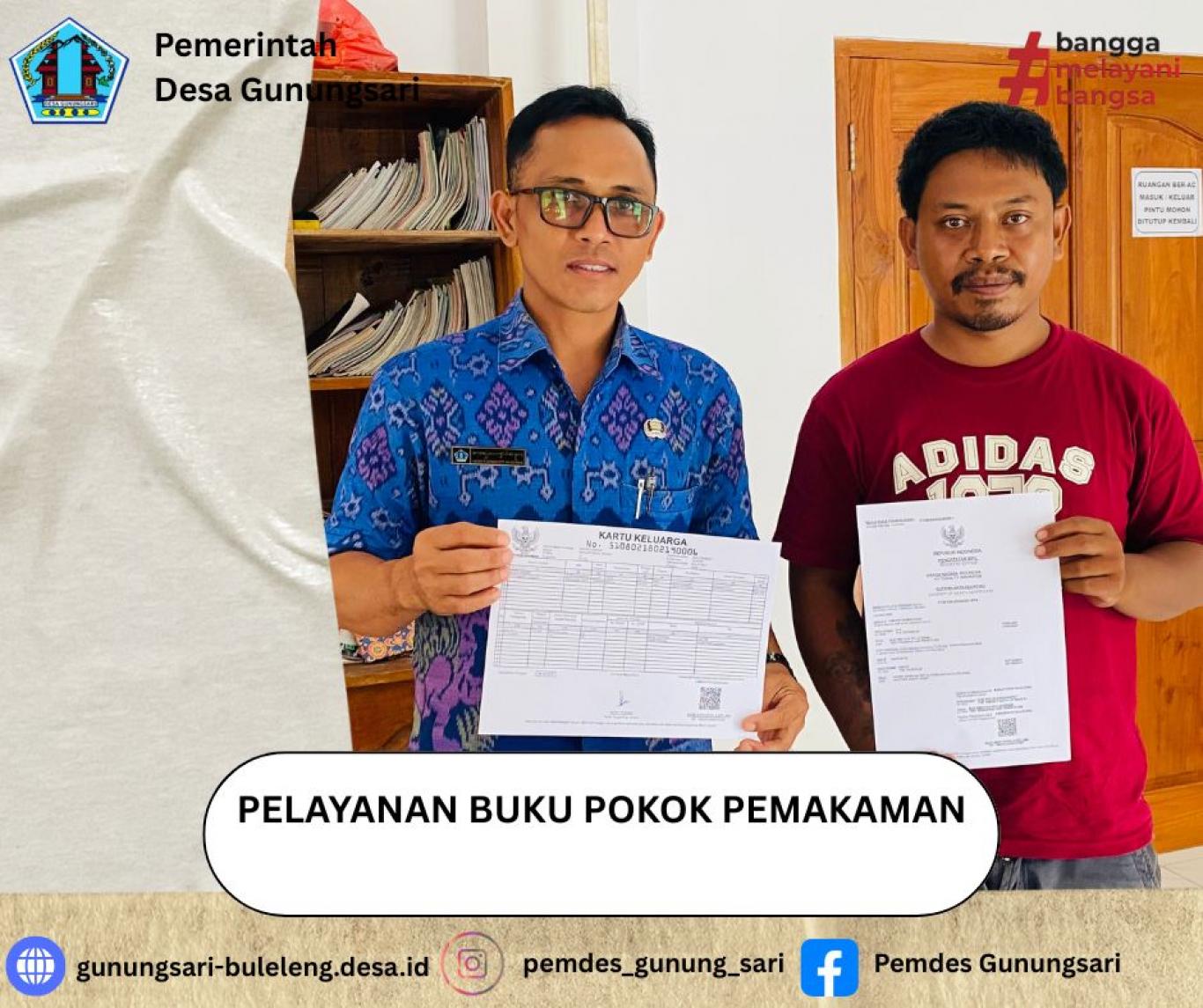 Pemerintah Desa Gunungsari melakukan Layanan Buku Pokok Pemakaman dengan menyerahkan dokumen berupa Kartu Keluarga dan Akta Kematian kepada Warga Banjar Dinas Sekar, Desa Gunungsari pada Selasa, 31 Maret 2026.