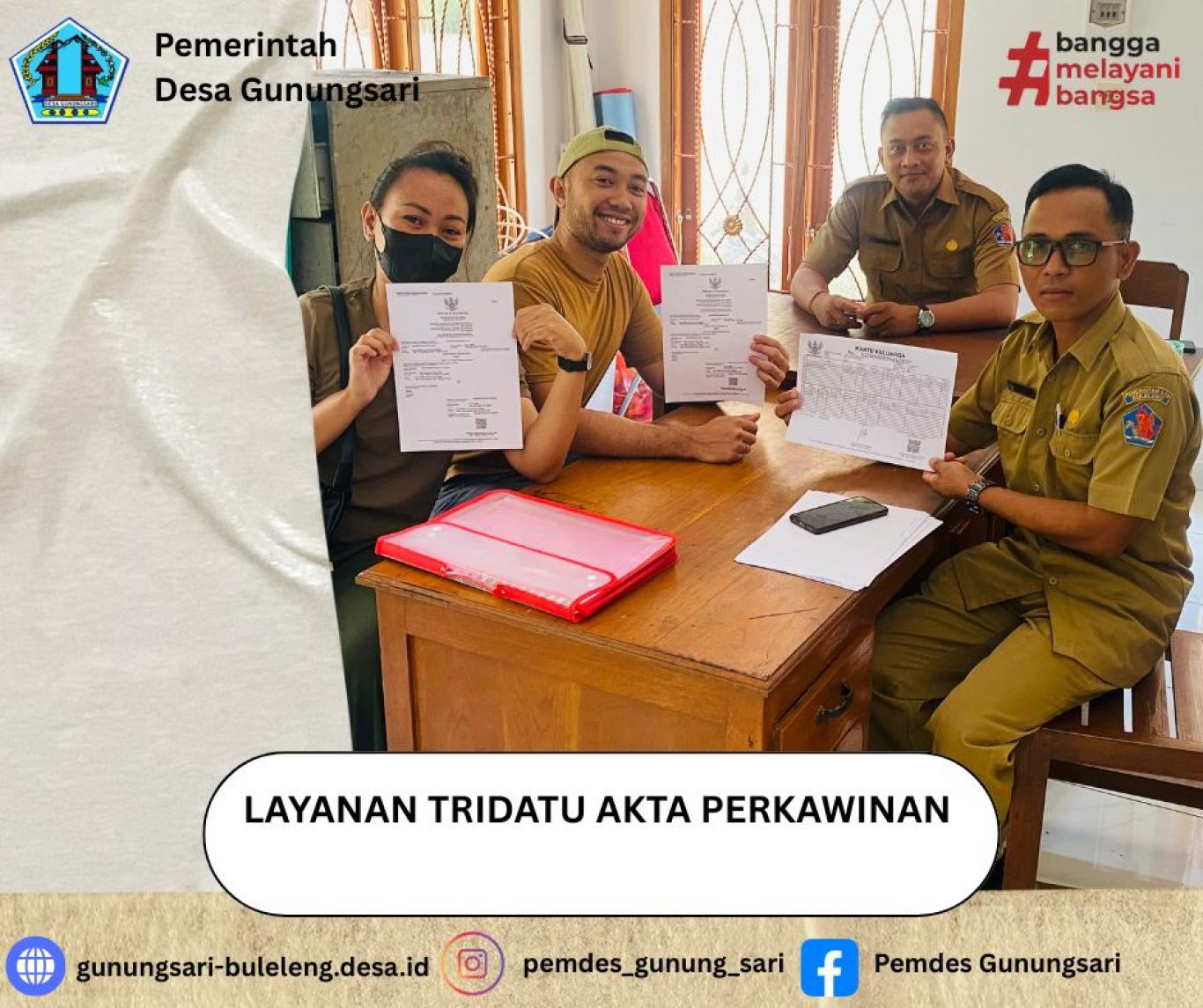 Pemerintah Desa Gunungsari melakukan Layanan Tridatu Akta Perkawinan dengan menyerahkan dokumen berupa Kartu Keluarga dan Akta Perkawinan kepada Warga Banjar Dinas Sekar, Desa Gunungsari pada Senin, 6 April 2026.