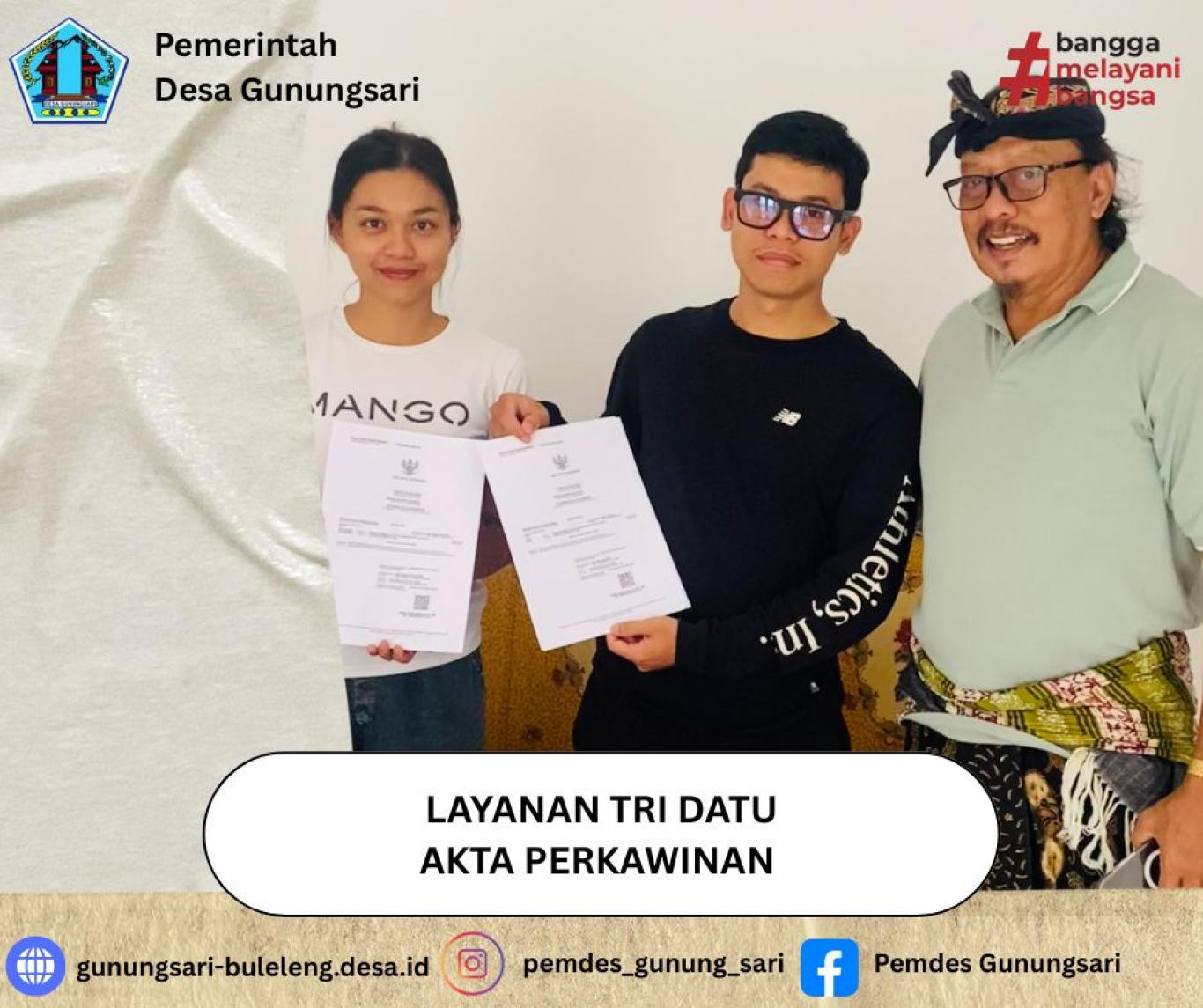 Pemerintah Desa Gunungsari melakukan Layanan Tridatu Akta Perkawinan dengan menyerahkan dokumen berupa Kartu Keluarga dan Akta Perkawinan kepada Warga Banjar Dinas Sekar, Desa Gunungsari yang diserahkan langsung oleh Perbekel Gunungsari pada Kamis, 23 April 2026.